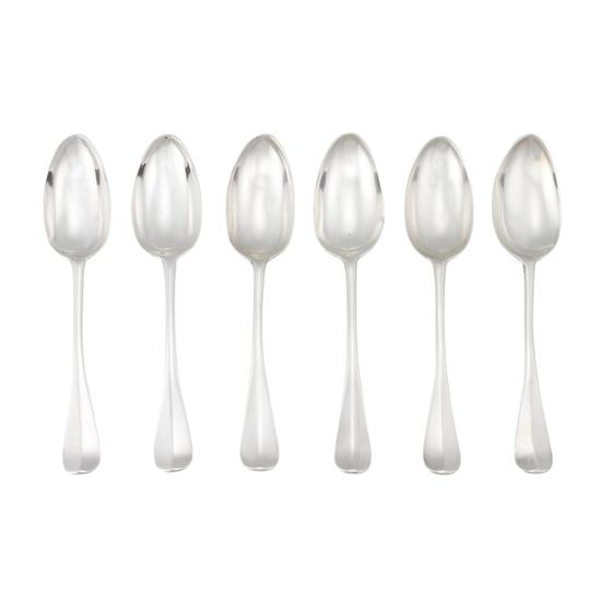 One of a set of six spoons with rounded upturned front midrib handle continuing to long egg-shaped bowl and rounded drop on bowl back. Inscription: Engraved on handle reverse: P P M. | Mark: Struck twice on handle reverse: TH.