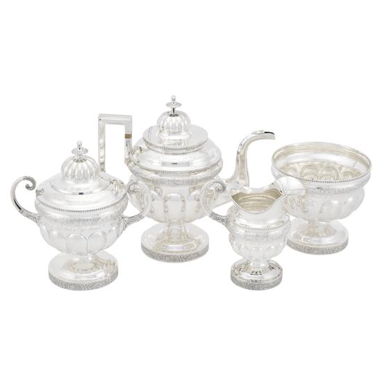 Teapot from tea service with round body, melon reeding on a stepped circular foot, die-rolled grapevine, oak-leaf and acorn border at foot and shoulder and die-rolled gadrooned border at lip. High domed cover with melon reeding and disk finials, square C-shaped silver handle with ebony inserts and S-shaped spout ornamented with leaflike applique at opening. Inscription: Engraved on body: The Citizens of New York to Capt. Samuel C. Reid. Mark: Marked on base: N. Taylor & Co. / [bird].