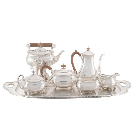 Coffee pot from coffee and tea service with oblong body, applied gadrooned trim, applied cast shell scroll feet, and wood C-shaped handle and finial. Inscription: Engraved with stylized block monogram on body: FLJ. Mark: Struck on underside, incuse: TIFFANY & CO. / 18084 MAKERS 7755 / STERLING SILVER / 925-1000 / m / SPECIAL HAND WORK / 2 ½ PINTS.