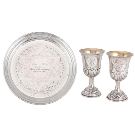 Circular salver with molded rim, engraved with Star of David motif in well, and inscription at center. Inscription: Engraved at center: "Edith and David/Goodstein/Golden Anniversary/March 13th, 1945". Mark: Stamped on base: "STERLING".