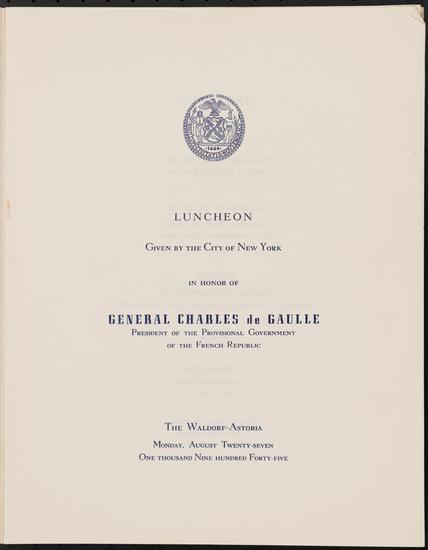 Luncheon Given by the City of New York in Honor of General Charles de Gaulle President of the Provisional Government of the French Republic