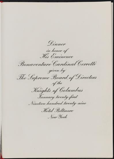 Dinner in honor of His Eminence Bonaventure Cardinal Cerretti given by the Supreme Board of Directors of the Knights of Columbus