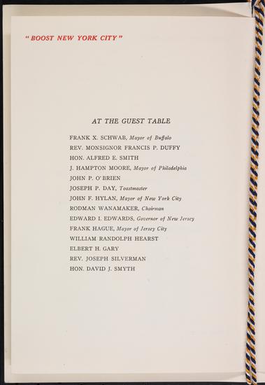 "Boost New York City". Dinner tendered to Honorable John F. Hylan, Mayor of New York City