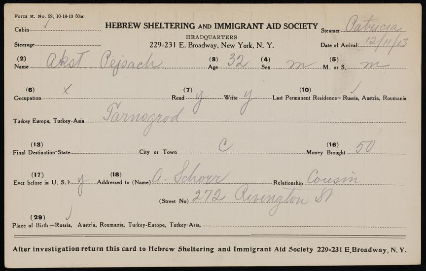 Immigration card issued to Rachmul Alperowicz by the Hebrew Sheltering and Immigrant Aid Society