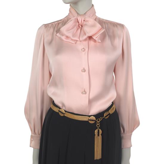 Evening suit comprising black sequined jacket and skirt with pink silk blouse and belt