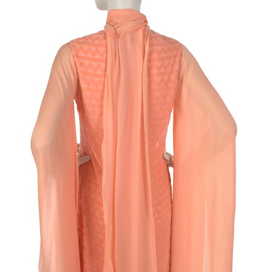 Evening suit comprising black sequined jacket and skirt with pink silk blouse and belt