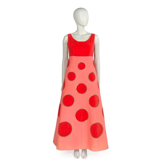 Ball gown of coral velvet, pale coral silk and applied oversize velvet dots