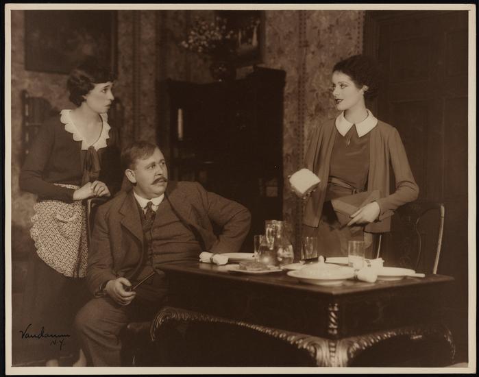 [Louise Hampton as Annie Marble, Jeanne de Casalis as Madame Collins and Charles Laughton as William Marble in Act 3 of "Payment Deferred".]