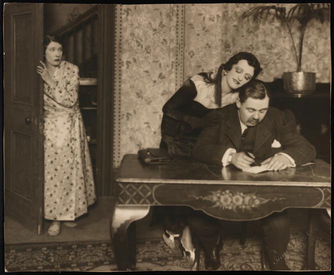 [Cicely Oates as Annie Marble, Dorice Fordred as Madame Collins and Charles Laughton as William Marble in Act 3 of "Payment Deferred".]