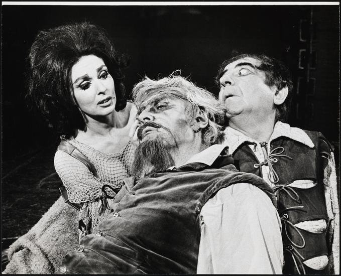[Bernice Massi as Aldonza (Dulcinea) and Hal Holbrook as Don Quixote (Cervantes) in "Man of La Mancha".]