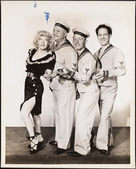 [Gertrude Niesen as Bubbles LaMarr, Buster West as Dinky Riley and Al Norman as Spud Doolittle in "Follow the Girls".]