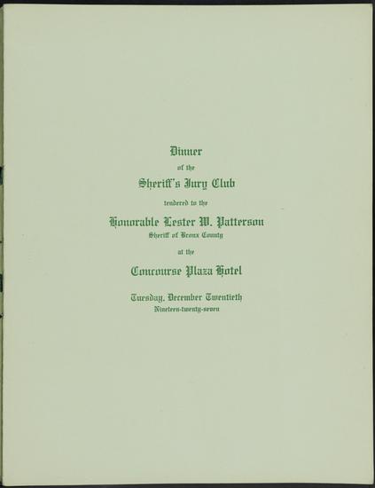 Dinner of the Sheriff's Jury Club tendered to the Honorable Lester W. Patterson, Sheriff of Bronx County