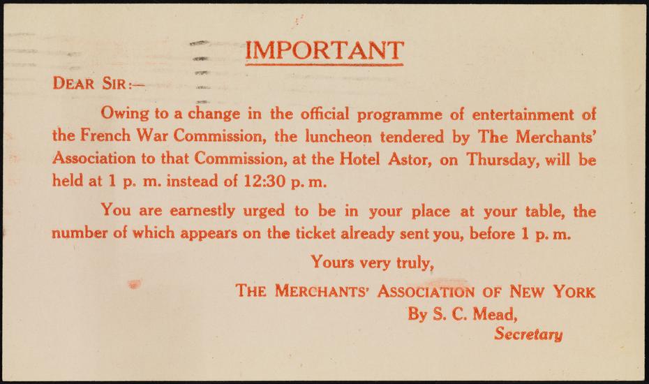 [Announcement of a change in program for the luncheon to the French War Commission held by the Merchants' Association of New York.]