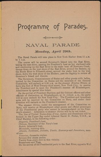 Programme of Parades, Washington's Inaugural Celebration, 1789-1889.