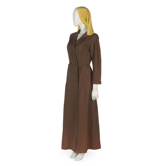 Hostess ensemble comprising ivory silk taffeta dress and black velvet cutaway coat