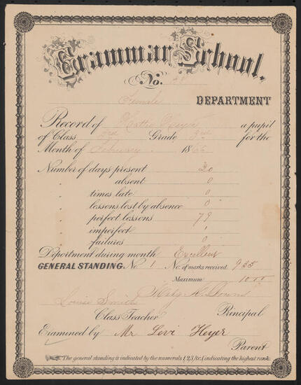 [Testimonial to punctuality, deportment and diligent attention to study.]