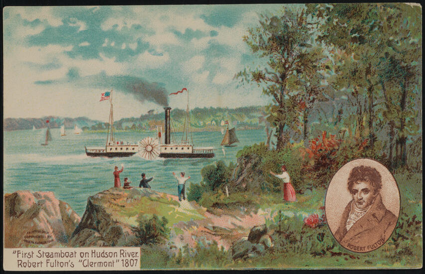 On August 17, 1808, the first steamboat, Rob't Fulton's "Clermont" started its famous trip up the Hudson River, and on Aug. 19th, arrived at Albany.