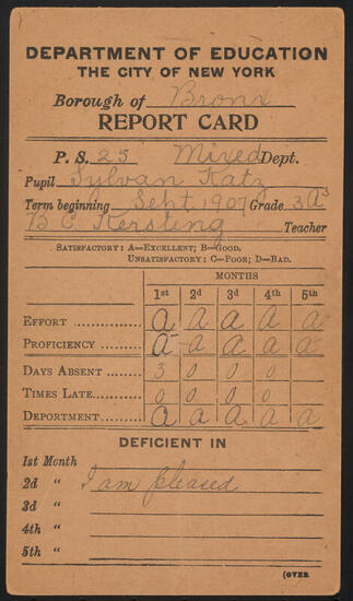 [Report of Sylvan Katz and certification of his graduation from Public School 10B.]