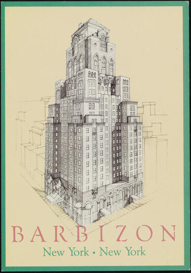 New York City views. View through loggia arch of Barbizon Hotel, 1.