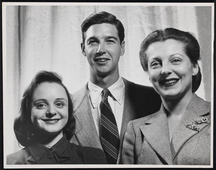 [Francesca Bruning as Ellen Curtis, Alexander Kirkland as Willis Reynolds and Patricia Peardon as Judy Graves in "Junior Miss".]