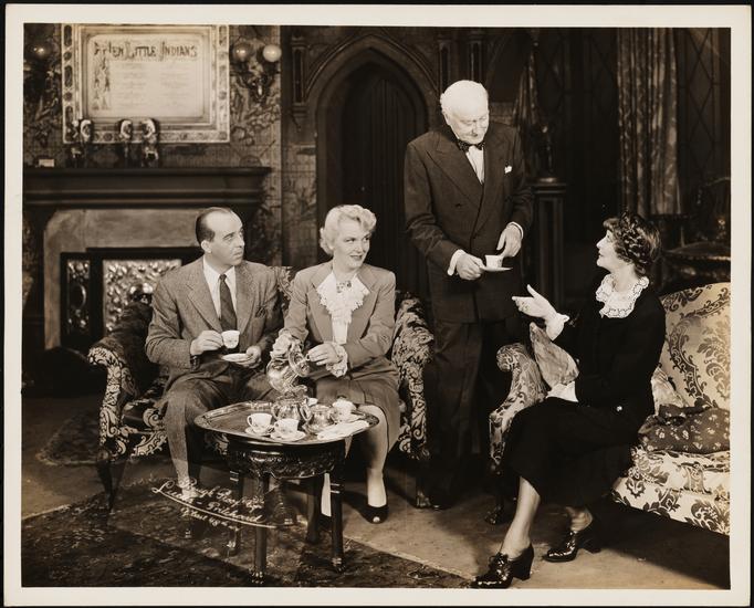 [J. Pat O'Malley as William Blore, Michael Whalen as Philip Lombard and Beverly Roberts as Vera Claythorne in "Ten Little Indians".]