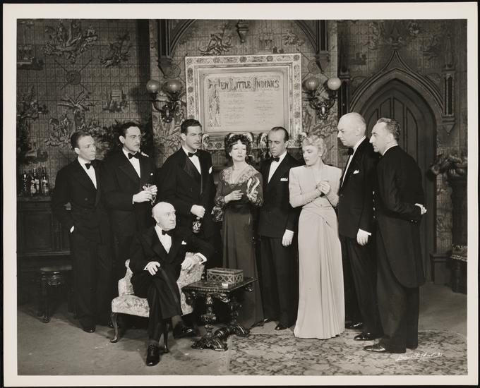 [J. Pat O'Malley as William Blore, Michael Whalen as Philip Lombard and Beverly Roberts as Vera Claythorne in "Ten Little Indians".]