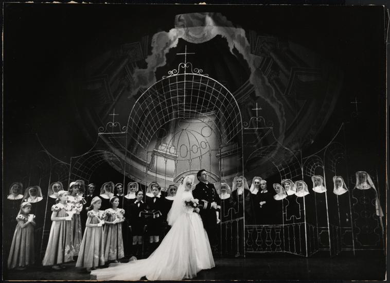 [Patricia Neway as The Mother Abbess, Mary Martin as Maria Rainer and Theodore Bikel as Captain Georg von Trapp in "The Sound of Music".]