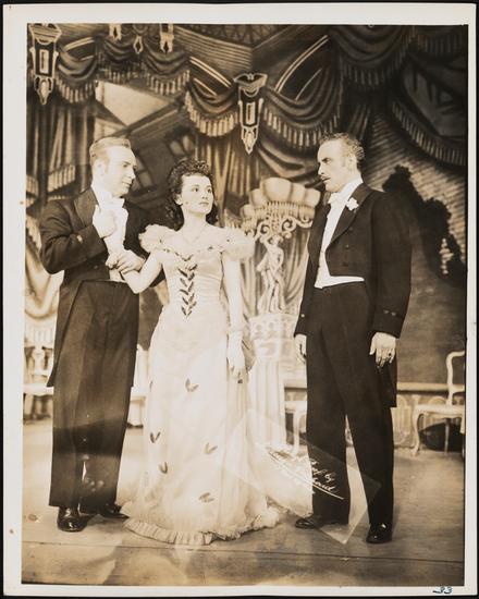 [Maureen Cannon as Rosie Moore, Wilbur Evans as John Matthews and Maurice Burke as Thomas Nast in "Up in Central Park".]