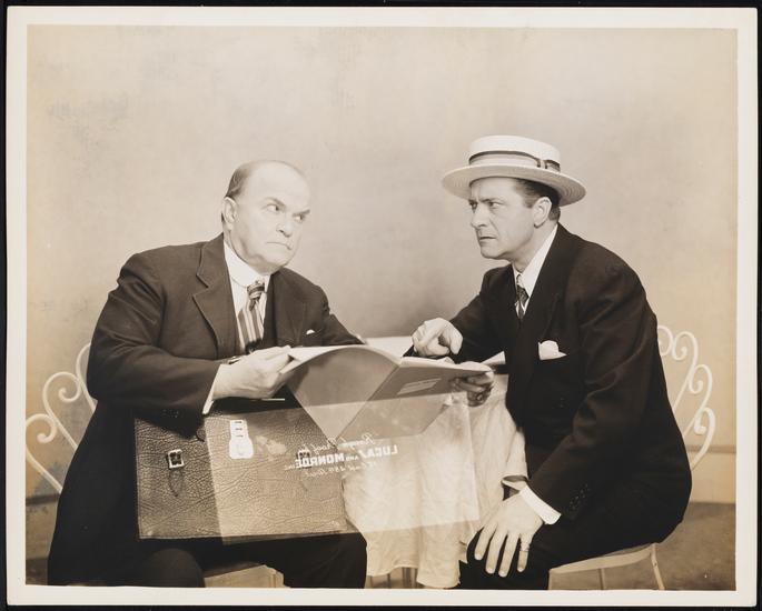 [William Gaxton as Jim Taylor and Victor Moore as Senator Oliver P. Loganberry in "Louisiana Purchase".]