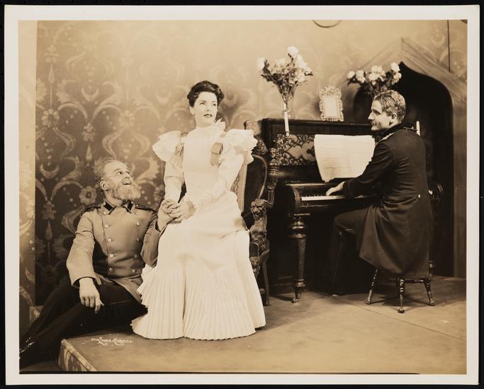 [Thomas Speidel as Solyony, Dorothy Mathews as Natalya Ivanovna and Katherine Emery as Irina in "The Three Sisters".]