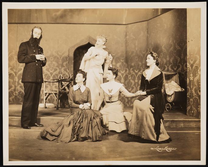[Shepperd StrudwicK as Vershinin, Anne Revere as Masha, Katherine Emery as Irina and Helen Wynn as Olga in "The Three Sisters".]