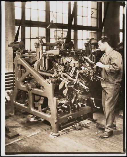 Interior, shoe factory with man at machine