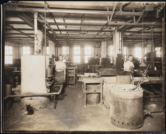 [Interior, manufacturing shop, metal melting furnace oven.]
