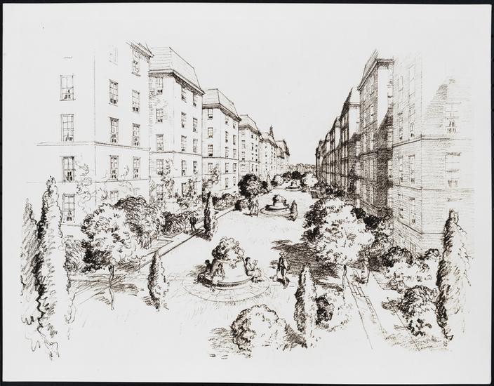 Jackson Heights apartments. Rendering, 1921, court gardens in rear of garden apartments.