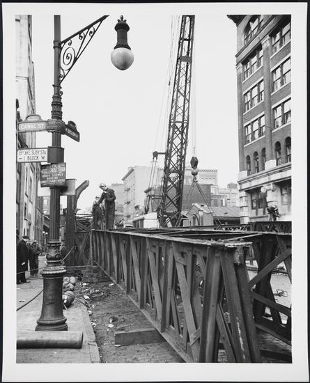 West 53rd Street and Sixth Avenue. Dismantling of the Sixth Avenue elevated train tracks.