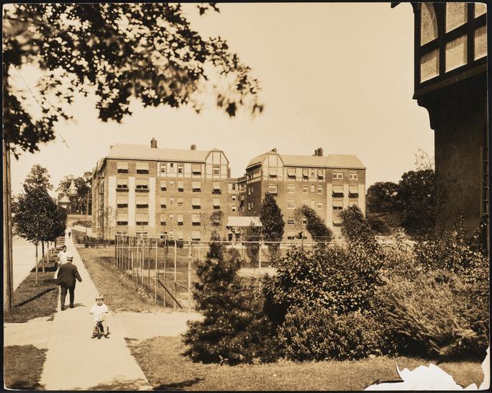 Jackson Heights Apartments. Rear of buildings with two men and child