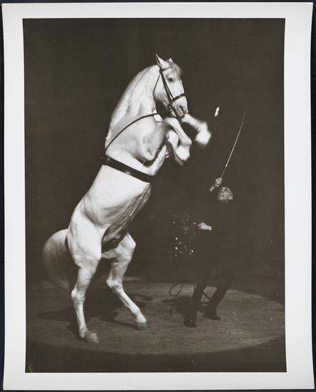 Circus [Ringmaster, with elephants and trainer in the background.]