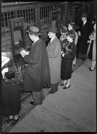 74 Wall Street. Seamen's Bank for Savings, flashlight views of depositors cashing Christmas Club checks, also opening new accounts for 1940.