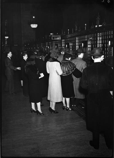 74 Wall Street. Seamen's Bank for Savings, flashlight views of depositors cashing Christmas Club checks, also opening new accounts for 1940.