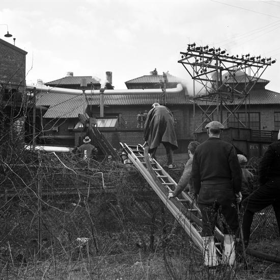 [Doctor treating fireman overcome by fumes at cold storage plant fire.]