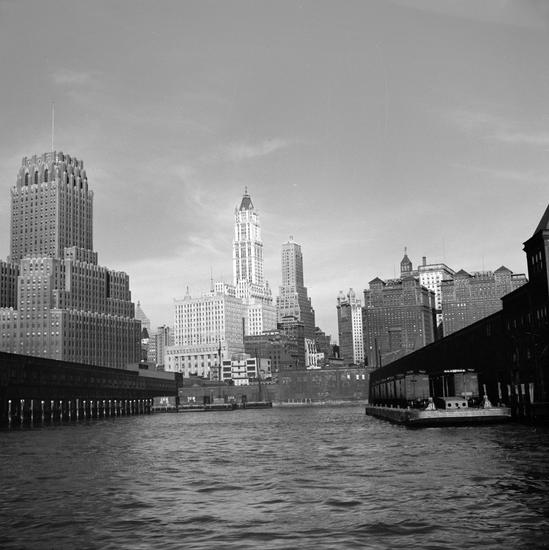 [View of Manhattan waterfront and skyline from Hudson River.]