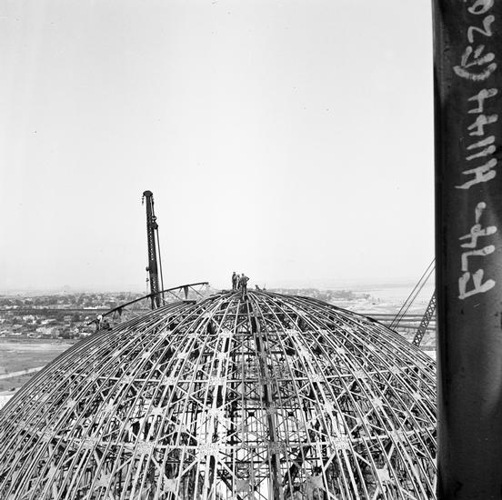 [Construction of the New York World's Fair site, showing the steel frame of the Perisphere.]