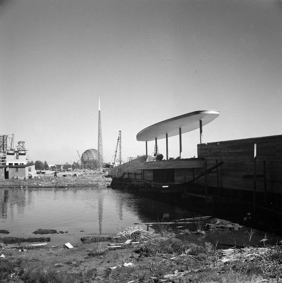 [Construction of Electrical Products building with frame of Trylon in background, New York World's Fair site.]