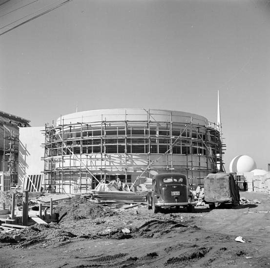 [Construction of Electrical Products building with frame of Trylon in background, New York World's Fair site.]