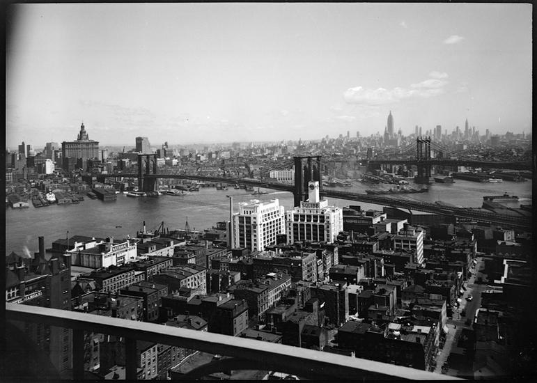 City view from 60 Wall [70 Pine Street] tower looking north up East River with Brooklyn Bridge, Manhattan Bridge and Williamsburg Bridge