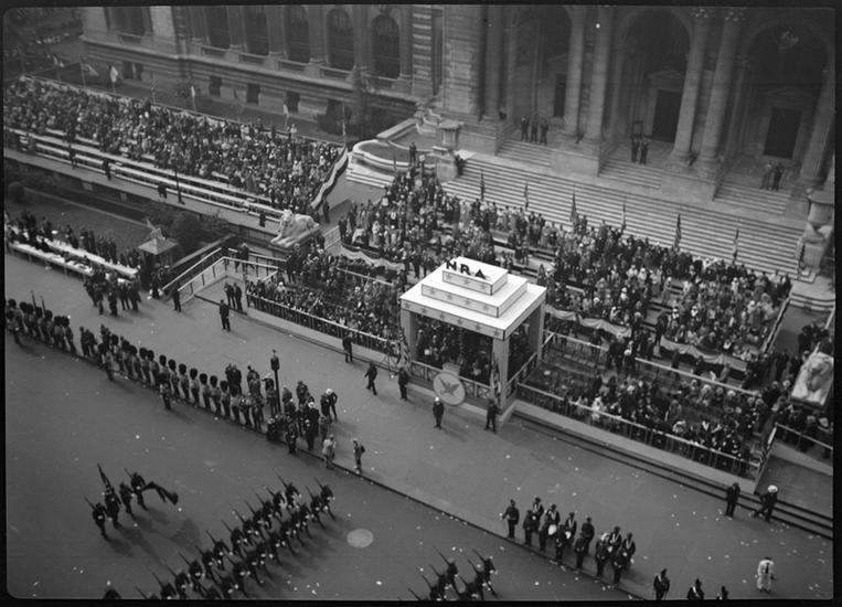 [Parade on Fifth Avenue, looking down on National Recovery Administration float.]
