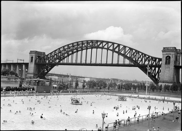 [Astoria Pool with Hell Gate Bridge in background.]