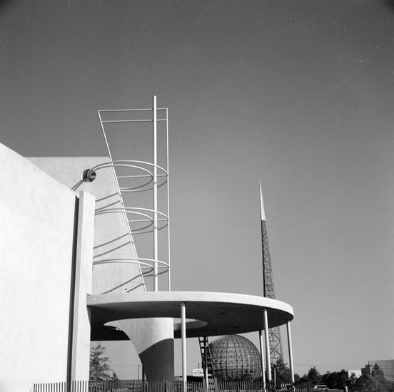 [Electrical Products building with the frame of the Trylon in the background, New York World's Fair site.]