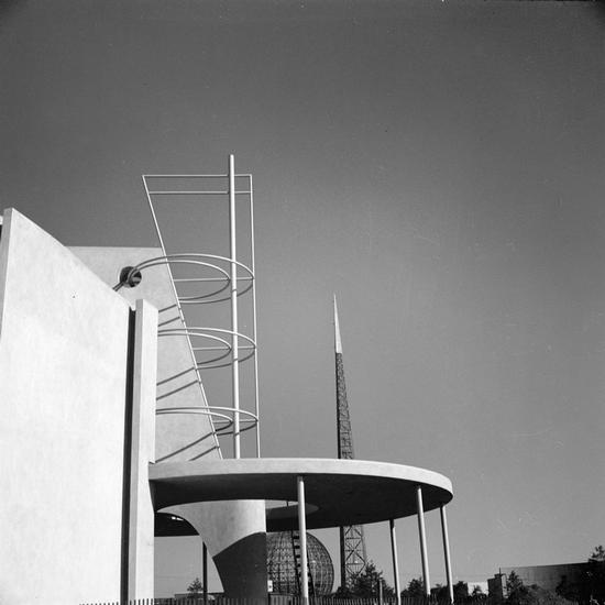 [Electrical Products building with the frame of the Trylon in the background, New York World's Fair site.]