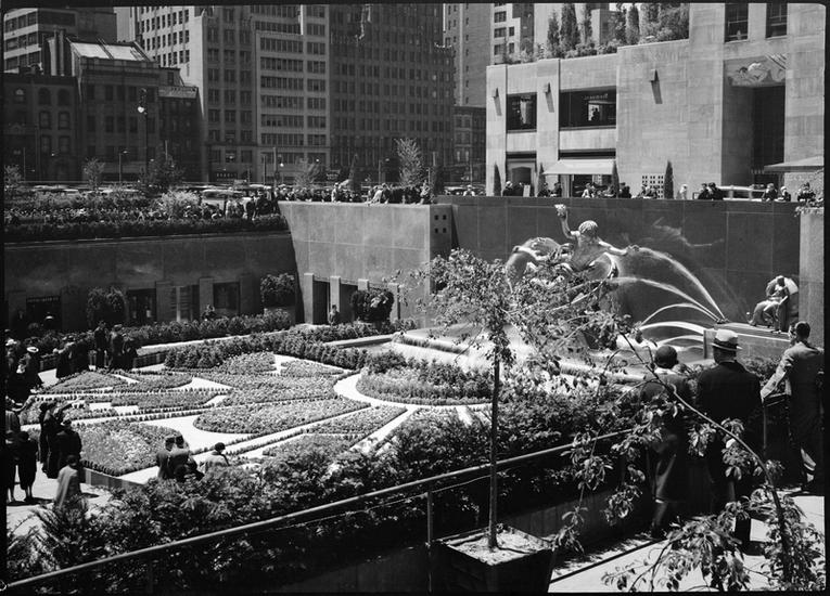 [Rockefeller Plaza. Two men in front of the Prometheus fountain in Rockefeller Center.]